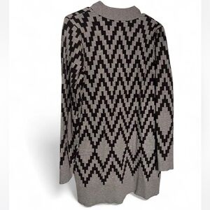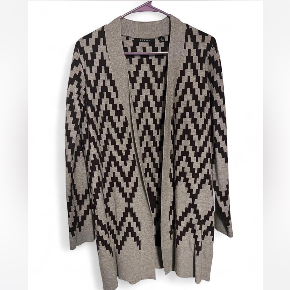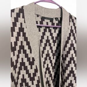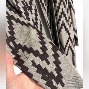 Stylish long cardigan with a bold geometric pattern. Features a mix of light grayish brown and dark brown