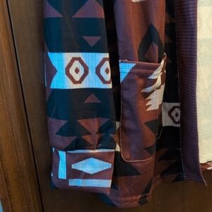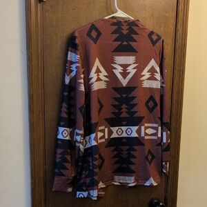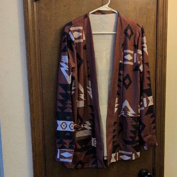 Stylish lightweight cardigan with geometric patterns. Features a mix of brown, black, and white colors. I smoke, so no guarantees you won't smell it. Some items are resold from Poshmark or other places I have purchased. I do not wash them. I try to inspect for defects but I don't get out a magnifying glass. All items sold as is. No returns. Ask questions! View pictures.