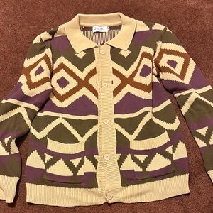 Stylish cardigan with geometric patterns. Features shades of cream, purple, and brown. Perfect for layering. Never worn.