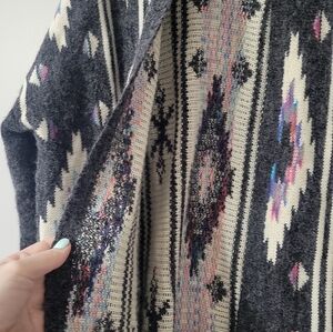 Stylish cardigan with geometric patterns. Features black, white, and colorful accents.