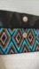 Stylish clutch featuring a vibrant geometric pattern. Perfect for adding a pop of color to any outfit. Includes shades of blue, orange, and black for a bold look.