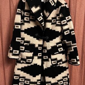 Stylish coat with a bold geometric pattern. Features black and cream colors.