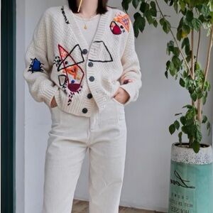 Stay cozy and stylish with this cream cardigan featuring unique geometric patterns. Perfect for adding a touch of artful flair to your wardrobe.
