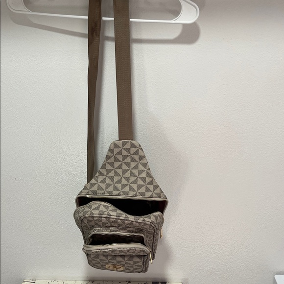 Stylish crossbody bag with a geometric pattern. Features a brown color with gold accents.