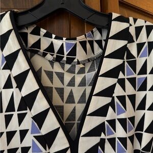 Stylish dress with a geometric pattern. Features a V-neck and short sleeves. Perfect for casual or formal occasions.
