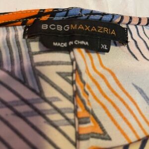 Stylish dress with a vibrant geometric pattern. Features a mix of orange, black, and white colors. Perfect for any occasion.