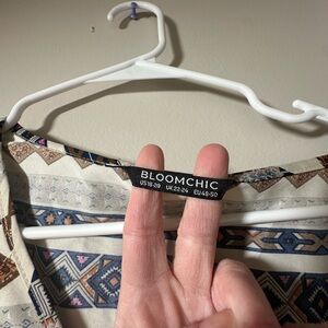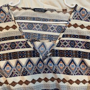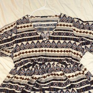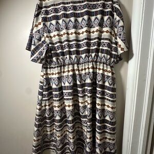Stylish geometric patterned dress with a mix of blue, brown, and cream colors. Perfect for any occasion. Size 18-20. Has pockets and elastic waistband.