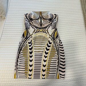 Stylish dress with bold geometric patterns in black, white, and gold. No longer have thin black belt that went with it. Excellent condition. Size 8