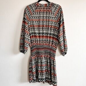 Stylish geometric patterned dress with a blend of black, white, and red colors. Perfect for any occasion.