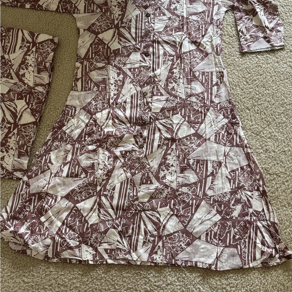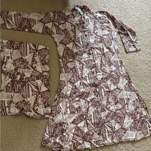 Stylish dress with a geometric pattern. Features a mix of brown and white colors.