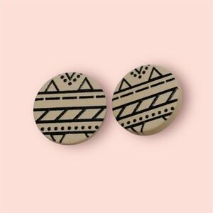 Round earrings with a black geometric pattern on a cream background. Stylish and unique design.