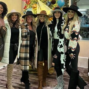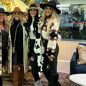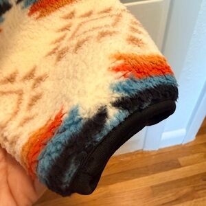 Cozy fleece jacket with a bold geometric pattern. Features a mix of black, cream, orange, and blue colors. Perfect for staying warm in style.