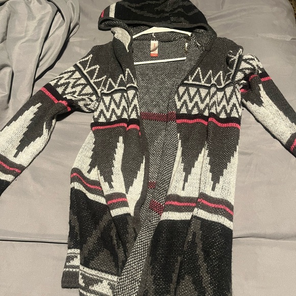 Stylish hooded cardigan with geometric patterns. Features black, gray, and pink colors.