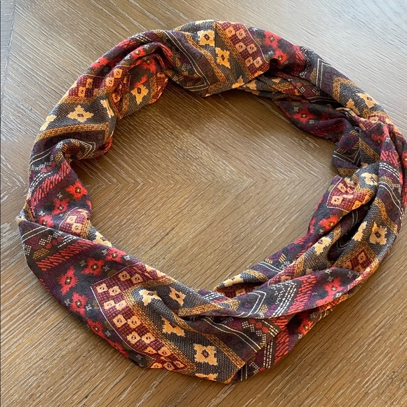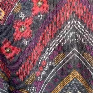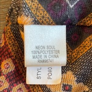 Elevate your style with this vibrant geometric patterned scarf. Featuring rich red, yellow, and purple tones, it's a versatile accessory for any wardrobe.