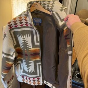Stylish jacket with a bold geometric pattern. Features a mix of earthy tones.