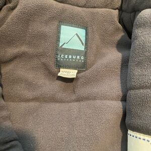 Stylish jacket with a geometric pattern. Features blue, teal, yellow, and black colors. Iceberg Sz 3T insulated hooded jacket