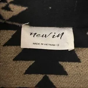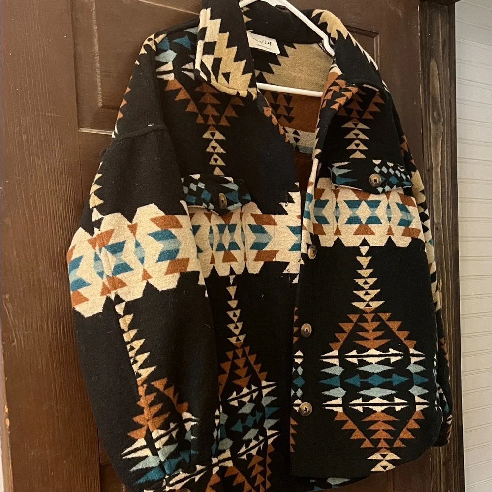 Stylish jacket with a bold geometric pattern. Features black, cream, blue, and brown colors.