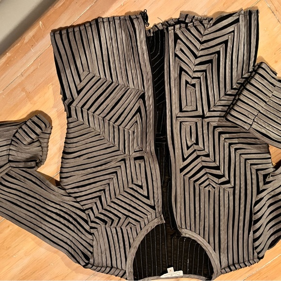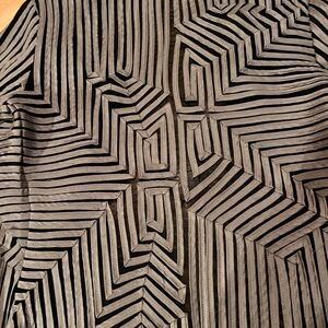 Stylish jacket with a unique geometric pattern. Features a striking black and gray design. Stretch with a bit of sheerness Size 8 Zipper Front