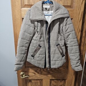Stylish jacket with a geometric pattern. Features a herringbone design and zip details.