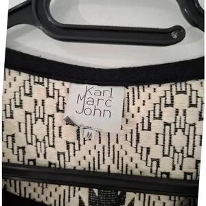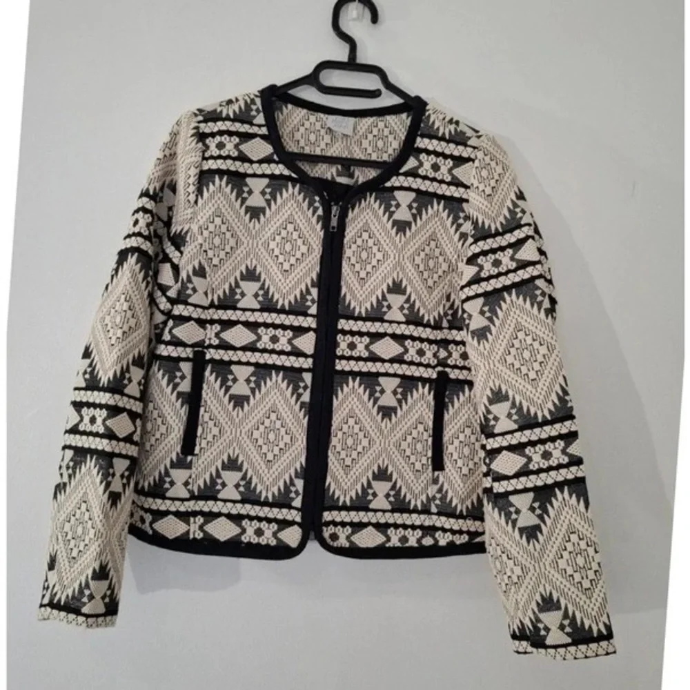 Stylish jacket with a black and cream geometric pattern. Perfect for adding a chic touch to any outfit.