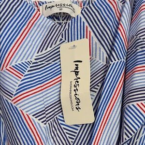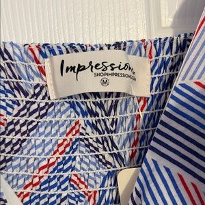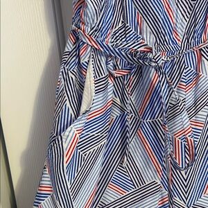 Elevate your style with this stunning geometric patterned jumpsuit. Featuring a blend of blue and red hues, this dress is perfect for any occasion. Enjoy the comfort and elegance it brings to your wardrobe.