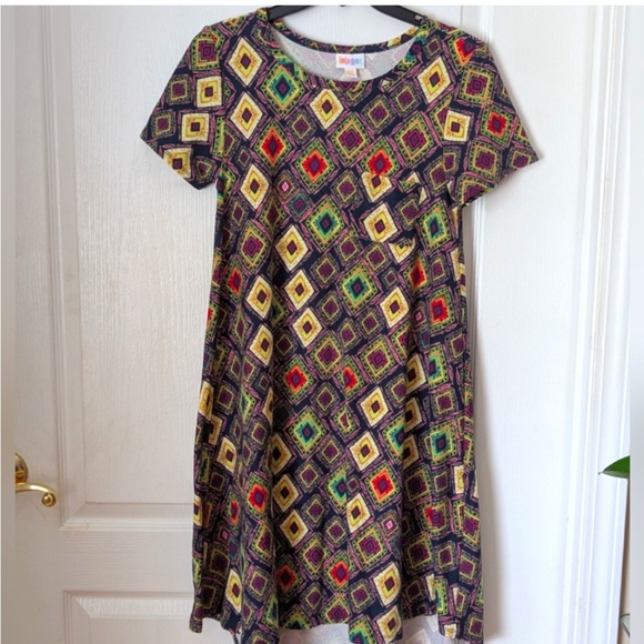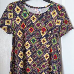 Stand out in this vibrant geometric patterned mini dress. Perfect for any occasion, this dress features a mix of colors that add a playful touch to your wardrobe.