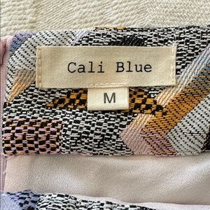 Stylish mini skirt with a geometric pattern. Features shades of pink, purple, and black. Zipper on back.