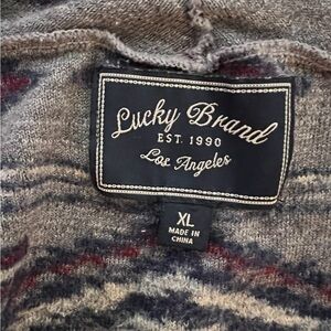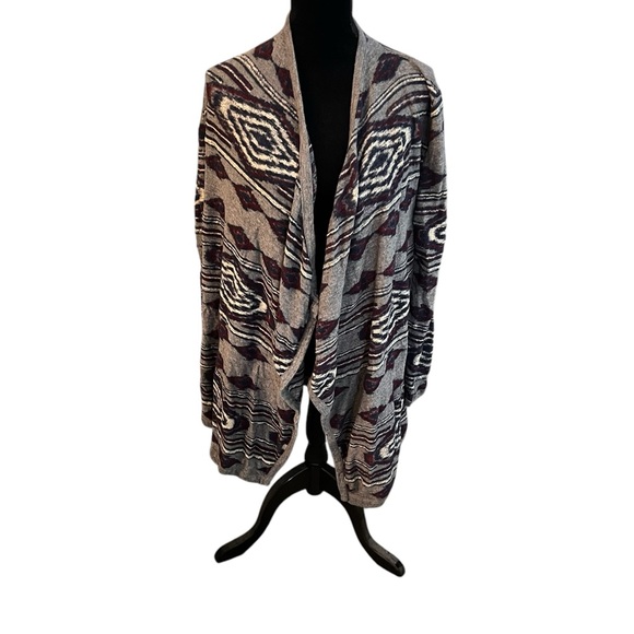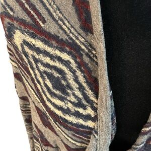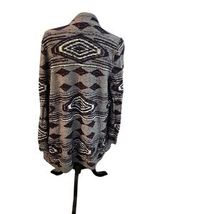 Stylish open cardigan with a geometric pattern. Features shades of black, gray, and cream and burgundy. Used condition but minimal pilling.