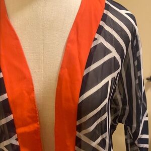 Stylish open front cardigan featuring a bold geometric navy and white pattern.,The vibrant orange trim adds a pop of color, making it a standout piece for any wardrobe. True to size but is meant to be oversized. Light and breezy material. New never worn item with tags still attached.