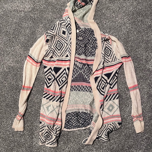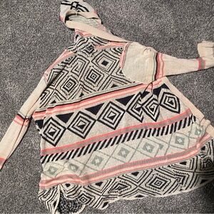 Stay cozy and stylish with this geometric patterned open front sweater. Featuring a blend of cream, pink, and black, this sweater is perfect for layering. Ideal for casual outings or a relaxed day at home.