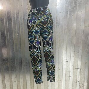 Stylish pants with a vibrant geometric pattern. Features a mix of blue, green, and black colors. Keep you warm with cold weather.