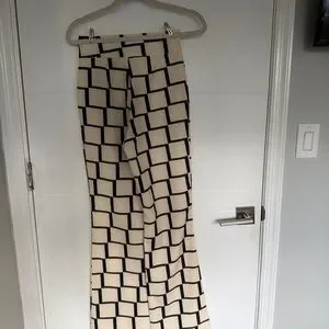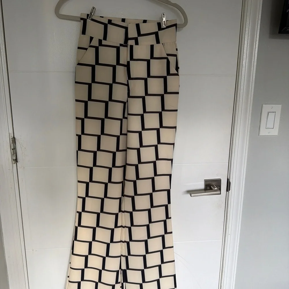 Stylish pants with a bold geometric pattern. Features a black and cream color scheme.