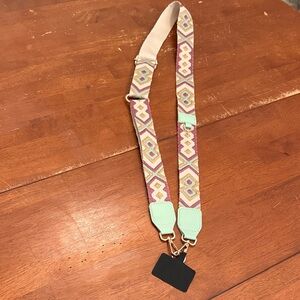 Wear your phone like a crossbody purse with this stylish geometric patterned strap. Featuring mint accents, it's perfect for adding a pop of color to your look. The black part at the bottom inserts right into your cell phone case. Perfect for sports events and times when you want to bring your phone but don't want to be burdened with a purse. Extra loop to attach keys or a small wallet.