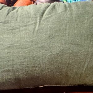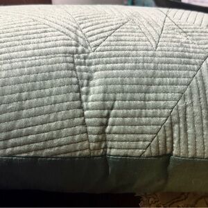 Stylish pillow with a geometric design. Features a textured pattern in a neutral tone. Light green on front side and dark green on back.