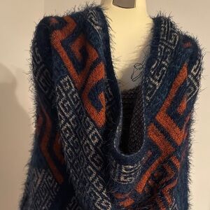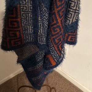 Hooded Poncho with geometric pattern in shades of blue, orange, and gray. Material appears to be a soft, possibly knitted or woven fabric, with a slightly fuzzy texture. The overall design suggests a bohemian or ethnic-inspired style.