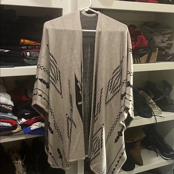 Stylish poncho with geometric patterns. Features a neutral color palette.