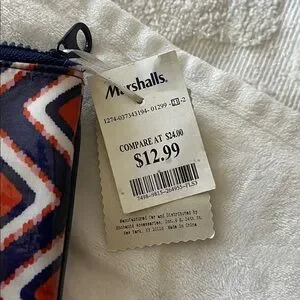 Set of three pouches with geometric patterns. Features red, blue, and white designs.