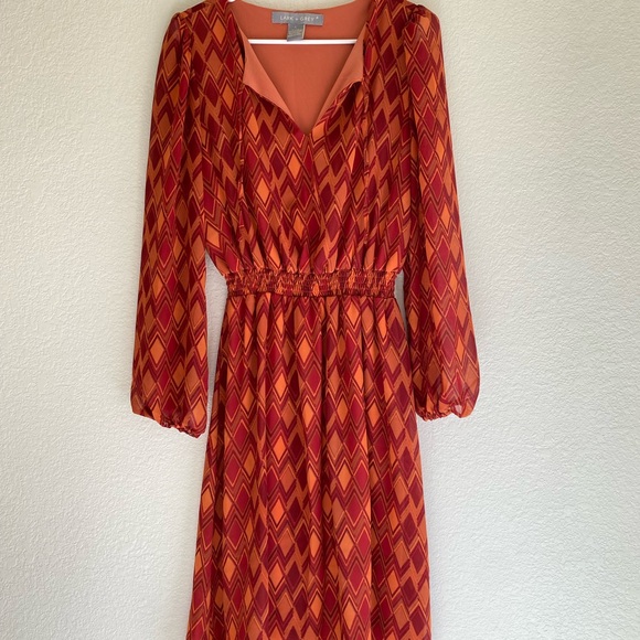 This stylish dress features a vibrant geometric pattern in shades of red and orange. Perfect for any occasion, it offers a flattering fit with its elastic waist and long sleeves.