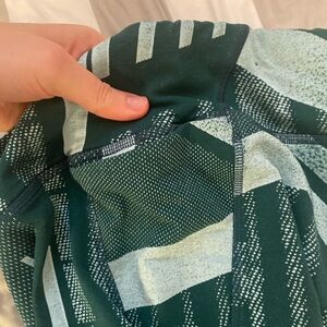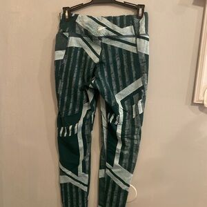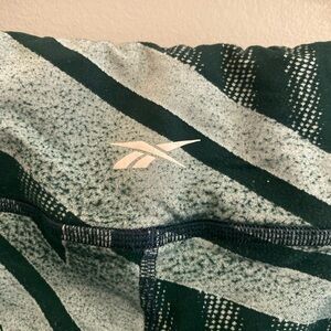 Reebok leggings with a dynamic pattern. Features dark green and white colors. Comfortable and stylish. Size medium. Pocket on one side