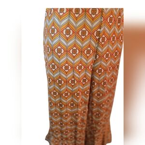 Elevate your style with these chic geometric patterned bell bottom pants. Featuring a vibrant orange and white design, these pants are perfect for your boho look!