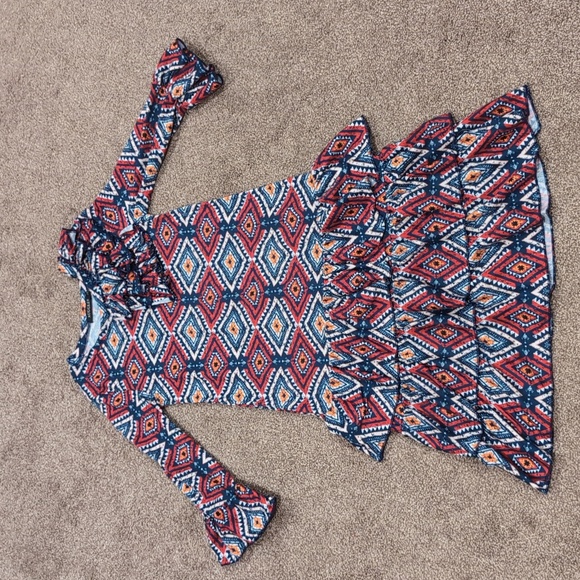 Stand out with this vibrant geometric patterned dress featuring stylish ruffle sleeves. Perfect for adding a pop of color to your wardrobe.