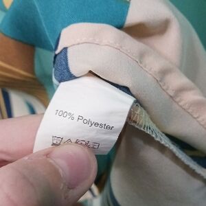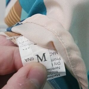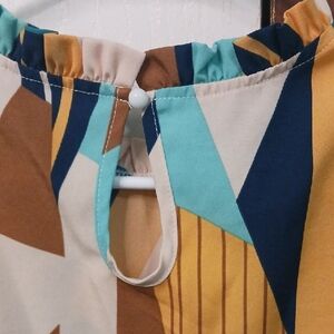 Elevate your style with this vibrant geometric patterned top. Featuring ruffle sleeves and a mix of teal, brown, and yellow hues, it's perfect for any occasion.
