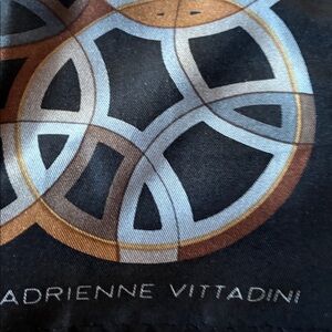 Scarf is about 11” wide and 54” long. Black background with blue gray brown and orange circle pattern