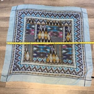 Stylish scarf with a geometric pattern. Features blue, yellow, and pink accents.
