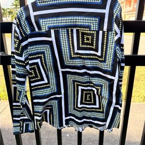 Stylish shirt and pants set with a bold geometric pattern. Features black, white, blue, and yellow colors.