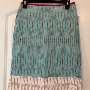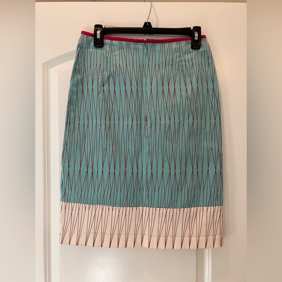 Stylish skirt with a geometric pattern. Features a mix of teal and red colors. Perfect for casual or office wear.