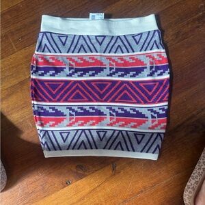 Elevate your style with this chic geometric patterned skirt. Featuring a vibrant mix of red, purple, and cream, this skirt is perfect for any occasion. Pair it with your favorite top for a standout look.