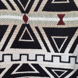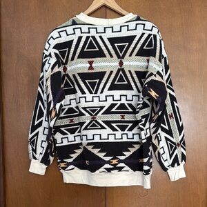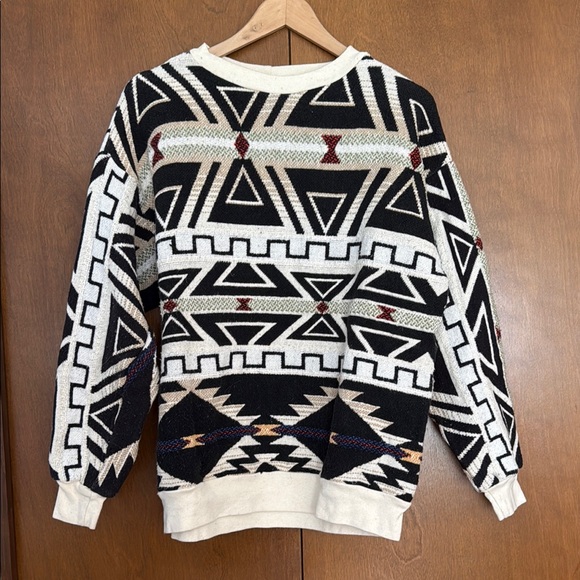 Stylish vintage sweater with a bold geometric pattern. Features black, white, and red colors. No size tag but fits like a medium.