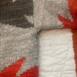 Stylish sweater with a bold geometric pattern. Features red, gray, and cream colors.