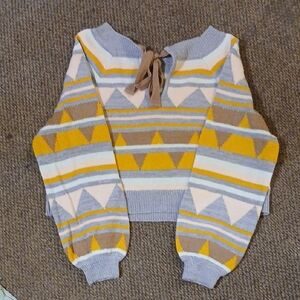 Stylish sweater with geometric patterns. Features gray, yellow, light pink and light blue colors. Perfect for a trendy look.